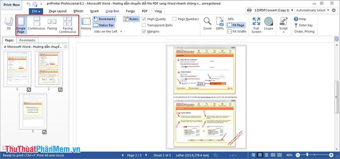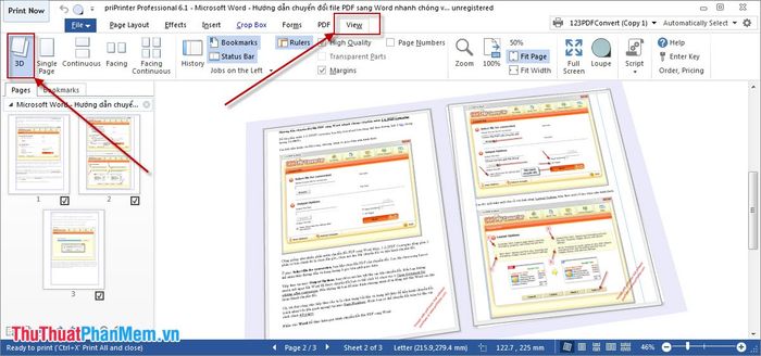 Step 3: You can change the way to view the print content on the main interface of priPrinter by selecting View -> 3D. The print pages will be displayed in 3D document format, similar to when you print on paper.