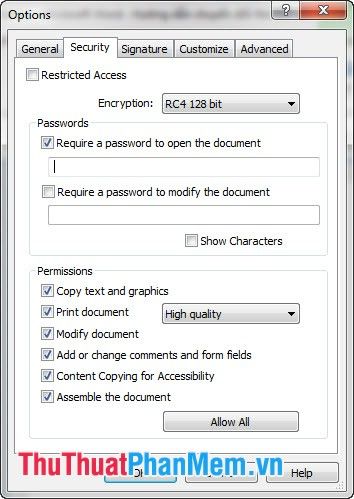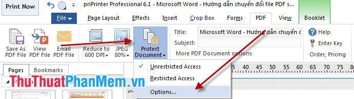 You can set a password for the PDF file by clicking on Protect Document and then choosing Options.