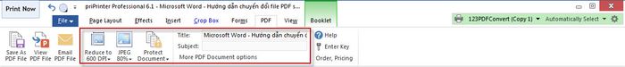 Apart from paper printing, priPrinter integrates tools to export page content into PDF format, ideal for creating e-books. In the priPrinter window, open PDF, then select resolution mode under Reduce to, image quality under JPEG, set title under Title, and topic content under Subject.