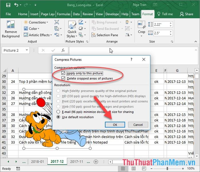 In the dialog box, check the Apply only to this picture and Delete cropped areas of pictures options (to remove cropped areas) -> click OK to compress the images: