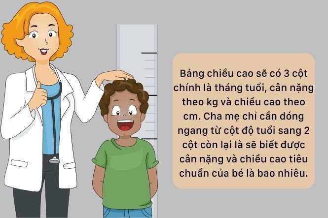There will be 3 main columns: age in months, weight in kg, and height in cm. Parents just need to cross-reference from the age column to the other 2 columns to know the standard weight and height of their child.