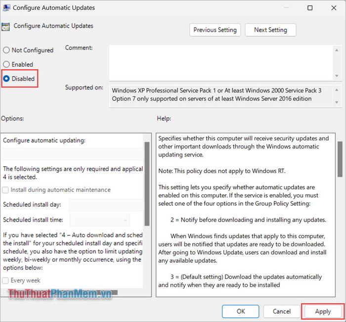 Step 5: To disable Windows 10, 11 updates permanently, choose Disabled and click Apply to apply the changes.