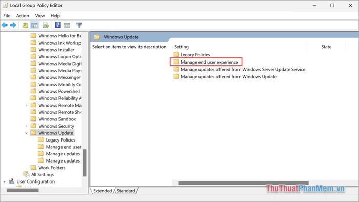 Step 3: Next, select the Manager end user experience folder to view Windows update settings.