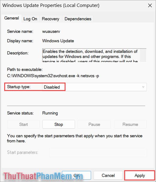 Step 3: In the Windows Update Properties settings window, set Startup type to Disabled and click Apply to confirm.