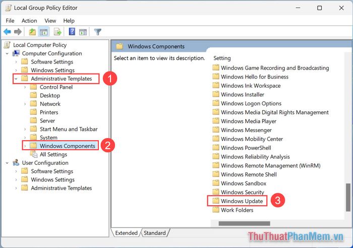 Step 2: Then, navigate to Administrative Templates (1) => Windows Components (2) => Windows Update (3).