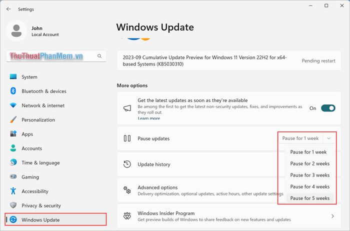 The Settings tool on Windows allows users to 'pause' updates for Windows 10, 11 for up to 5 weeks. After 5 weeks, you can continue to pause updates if desired. If you only want to temporarily disable updates but still want to receive the next update later on, this is the most effective method.