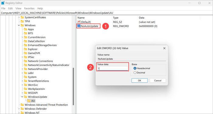 Step 3: To disable the auto-update feature on Windows 10, 11, select the NoAutoUpdate (1) entry, set Value Data to 1 (2), and press OK to finish.