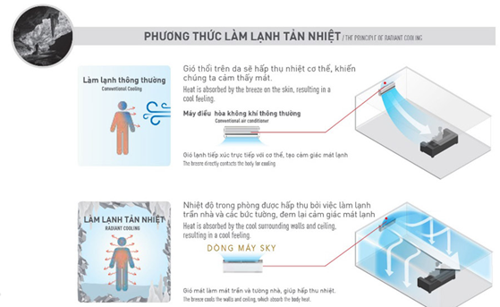 A comparison chart of the two cooling methods explains why the 'Radiant Cooling' function of the SKYWING blade rotation provides a cooler and more comfortable sensation for users.