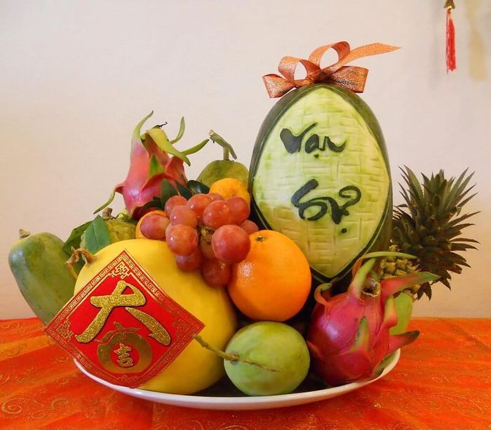 Design 2: Another beautiful and meaningful Tet fruit tray arrangement involves engraving meaningful messages on watermelons, along with sturdy fruit placement to attract good fortune and wish for a peaceful year ahead.