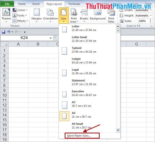 2. To set paper size, select Page Layout -> Size -> More Paper Sizes.