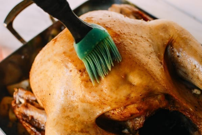 Take the chicken out of the oven, flip it over. Brush honey onto the chicken. Reduce the oven temperature to 160°C and roast for about 10 more minutes, brushing with honey again. Roast for another 10 minutes until done.