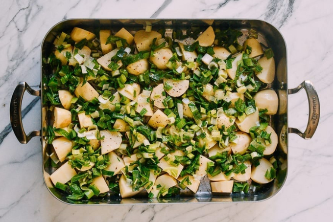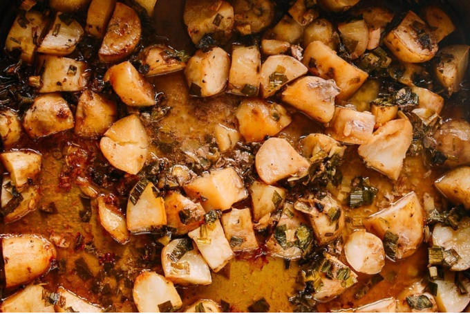 Remove the potatoes and garlic from the pan. You can leave them whole or mash them into delicious roasted mashed potatoes (just add milk, butter, and salt to taste).