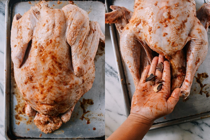 Rub the chicken inside out with the sauce, ensuring all surfaces are thoroughly coated. Place the dried tangerine peel inside the chicken cavity along with any remaining sauce.