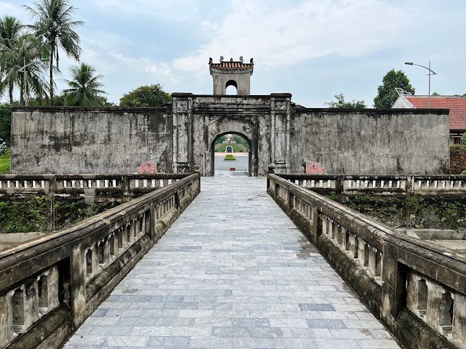 The citadel was constructed following the typical fortress architecture of Vietnam, with the perimeter wall made of large fired bricks bonded with lime and molasses. It features four main gates in each direction. Each gate consists of two levels: the lower level is constructed with arched vaults using the technique of 'four vertical stones, a horizontal one in between, and a keystone,' while the upper level is a pavilion built of bricks, with a curved roof covered in yin-yang tiles.