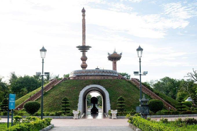 People refer to Quang Tri Ancient Citadel as the 'graveyard without tombstones' because there is only one communal tombstone, a mass grave monument located in the center. At the base of the tombstone, it is shaped like an octagon, symbolizing the eight trigrams, with four stairways representing the four cardinal directions. On the top sacrificial offering layer is a stylized Vietnamese communal house.