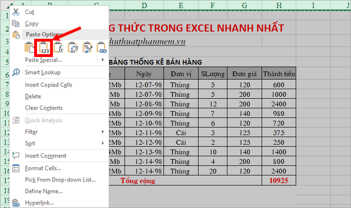 Step 3: Next, right-click again, in the Paste Options section, select the Values icon (V).