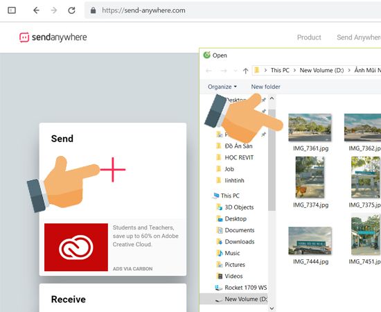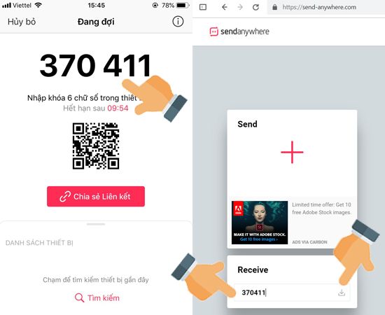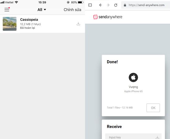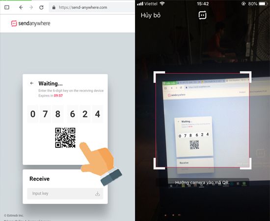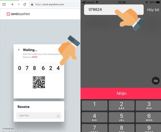 + Click the plus sign in the Send section on the laptop web to add the data to send -> Enter the displayed code on the laptop web into iPhone/iPad or use iPhone/iPad camera to scan the QR code to receive data.