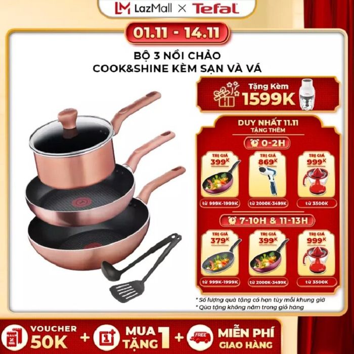 This Tefal Cook&Shine cookware set includes a 24 cm frying pan, a 28 cm sauté pan, and an 18 cm long pot with spatula and spoon. Not only is it 48% OFF, REDUCED FROM 2,799,000 VND TO ONLY 1,574,000 VND, but when purchased during the 11.11 day at 00:00, you also get an enticing gift: the Tefal 3-in-1 Food Processor MB520138 – 300W, 400mL worth 1,599,000 VND. Moreover, many special gifts such as a pan, thermometer, or orange squeezer are waiting for you to grab in various time frames. Genuine product with a 2-year warranty. Grab this hot household deal here for a delightful family meal!