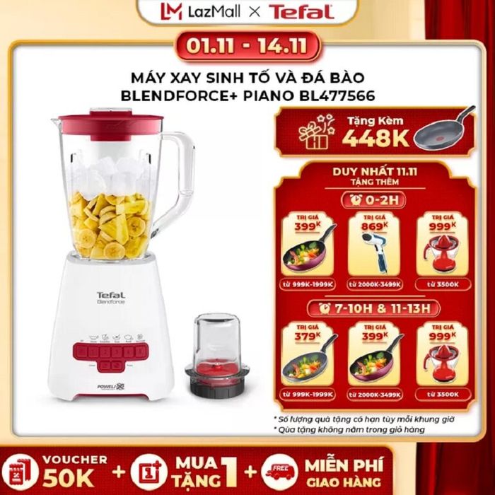 During the 11.11 Big Sale Day on Lazada, this Tefal Blendforce Piano BL477566 smoothie and ice-crushing blender is on sale for 35% OFF, NOW ONLY 1,299,000 VND, and comes with an additional gift, the Tefal Natura 28cm frying pan worth 448,000 VND.
