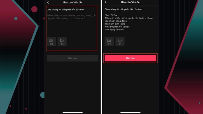 Step 4: In the complaint form, describe the violation. Attach images or videos to prove the violation. Once completed, press the 'Report' button. The system will record your complaint. Then it will provide results after the review process. This way, you have completed the TikTok community standards violation resolution process, just wait for the system to return results and the violation to be completely removed.