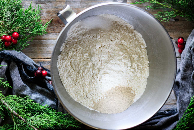 Flour & yeast: Pour both types of flour into the mixing bowl, then add salt and yeast to opposite sides of the bowl. Use your fingers to mix salt and yeast evenly, ensuring salt does not directly contact yeast as it could kill it.