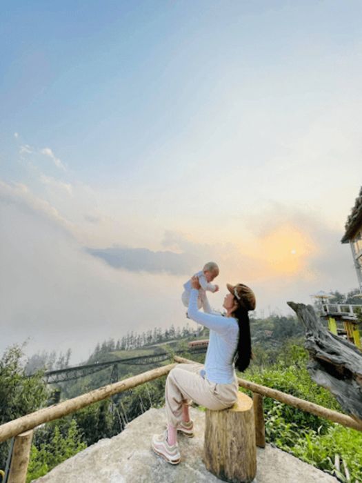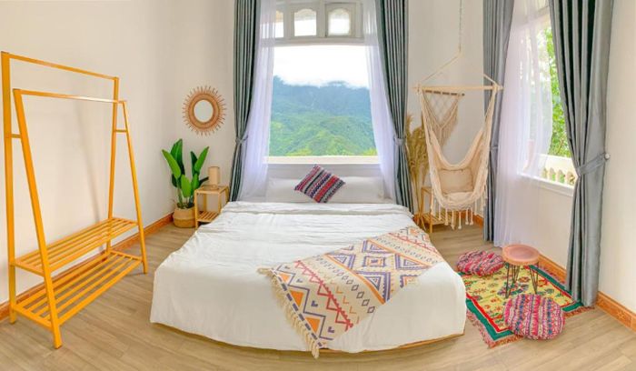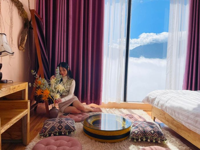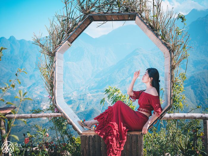 Sitting by the small courtyard, sipping coffee, and gazing directly at the majestic Hoang Lien Son mountains, you'll instantly have a profound photo set. Whether you transform into a poetic figure in the Muong Hoa Valley or become a local ethnic girl immersed in the stunning scenery of Sapa, it's all a brilliant idea.