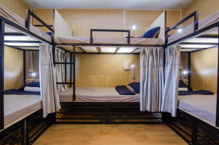 The dorm room features a bunk bed setup for 6 people, with en-suite bathrooms and communal space furnished in simple tones of ash gray and cobalt blue. Each bed also comes with a curtain for added privacy, ensuring discretion for travelers when needed.