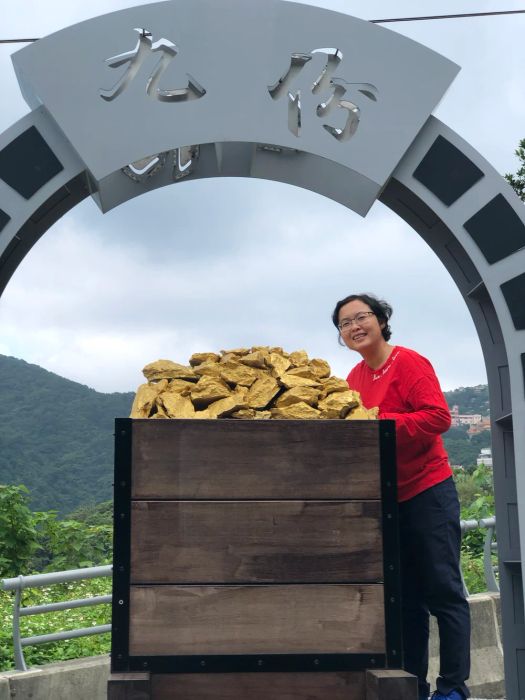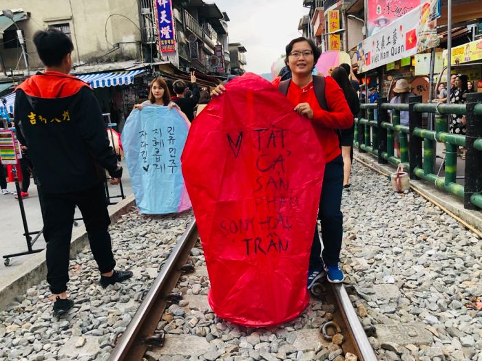 Afterward, Lily continued to Jiufen to experience authentic Taiwan tourism. Taking photos with this golden car, hoping that there will soon be a big 'gold lump' like that. Next, Lily went to Shifen to release lanterns for peace, not only for family but also for ongoing projects.