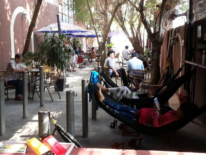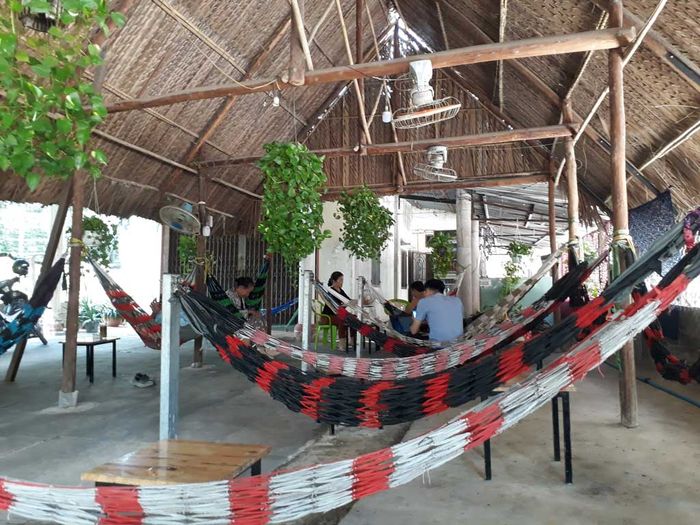 The cafe is located in a narrow alley, quite inconvenient for group travelers. However, the cafe boasts an extremely spacious area. Designed in leaf huts style, each hut is equipped with 2-3 hammocks. Whenever you visit the cafe, you'll always find perfect short naps.