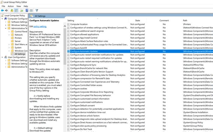 - Continue by navigating to: User Configuration > Administrative Templates > All Settings.