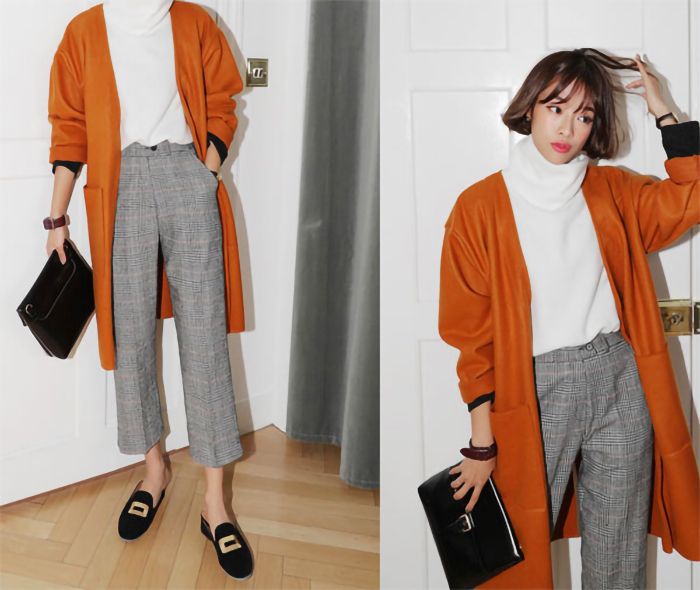 This can be considered a highly fashionable and elegant combination for office ladies. You can mix a turtleneck sweater with wide-leg pants or trousers.