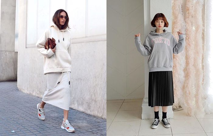 This outfit mix will make women look extremely youthful, dynamic, and energetic. It's a suitable outfit for women under 35. Depending on the age, women can choose the appropriate style of hoodie, skirt, and shoes as follows:
