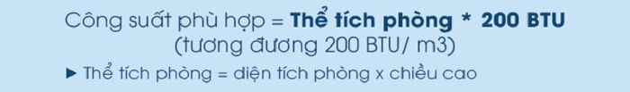 Example: For a room with a volume of 50m3, you will have: 50 m3 x 200 BTU = 10,000 BTU. Meaning you should choose an air conditioner 1.5 – 12000 BTU for a room with a volume of 50m3. Below are some suggestions for air conditioner capacity based on room volume you can refer to: