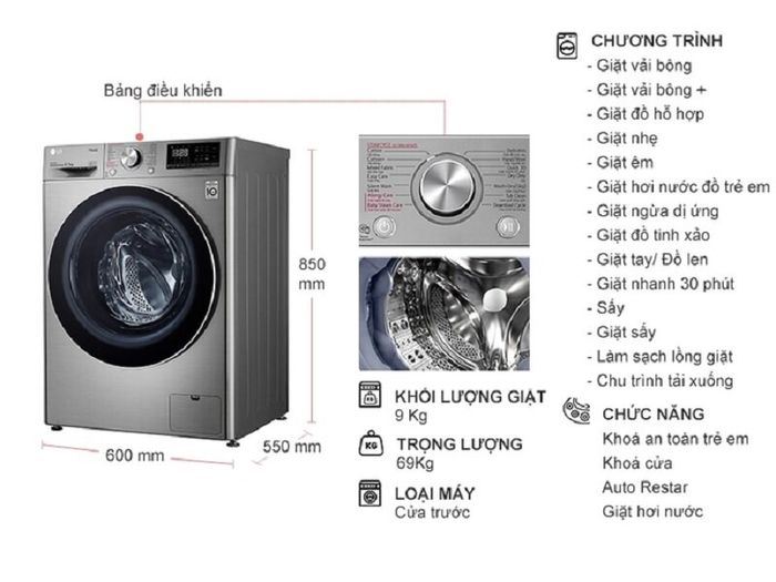 The LG Inverter 9kg FV1409G4V washer dryer is the most affordable LG washer dryer model of 2023, priced at only 13,490,000 VND. Despite its low price, the product is equipped with a modern motor that is no different from premium washer dryer models. Especially with AI artificial intelligence technology and direct drive motor.