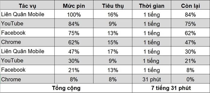 The battery life of Redmi Note 12 is measured from the time the device was first launched.The result of this battery test is 7 hours and 31 minutes, slightly shorter than the 9 hours and 5 minutes from the launch time, but still relatively good for a device that has been used for 6 months. For heavy tasks like playing Liên Quân Mobile, Redmi Note 12 consumes about 16 - 17% per hour, while lighter tasks like web browsing or Facebook only consume about 9 - 13% per hour.