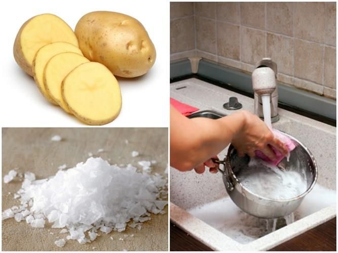 Potatoes contain oxalic acid, which acts as a cleanser, dissolving rust without affecting the surface of stainless steel. Cut potatoes into evenly thick slices, sprinkle a bit of salt, and scrub onto the rust stains until the pot regains its shine.