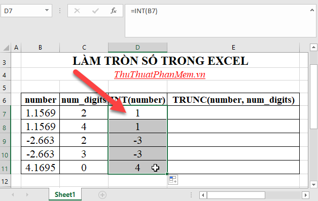 In the cell where you want to round using the Int function, enter the formula: = INT(B7)