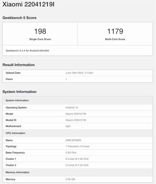 As revealed by Gizmochina, a Xiaomi phone with model number 22041219I has appeared on the renowned Geekbench benchmarking site. This new device is believed to be the Redmi 10 Prime+ 5G, scoring 198 in single-core and 1,179 in multi-core performance.