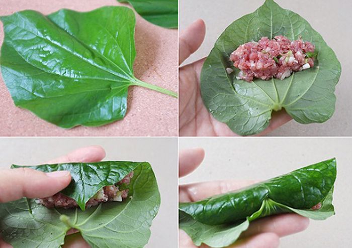 - Use a cutting board or flat plate, then place betel leaves on it, folding the edges on both sides of the leaves. Add a moderate amount of minced beef and egg mixture in the center. Evenly spread the filling into a long sausage shape and roll it up. Repeat this process until all the filling and betel leaves are prepared.