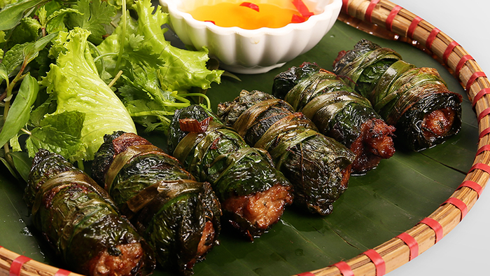Betel leaf-wrapped beef rolls are a familiar delight in many households. Typically made with pork in traditional recipes, this version with beef brings a delicious and unique flavor. It has a chewy and succulent texture, complemented by the fragrant essence of betel leaves, making it irresistible from the first bite.