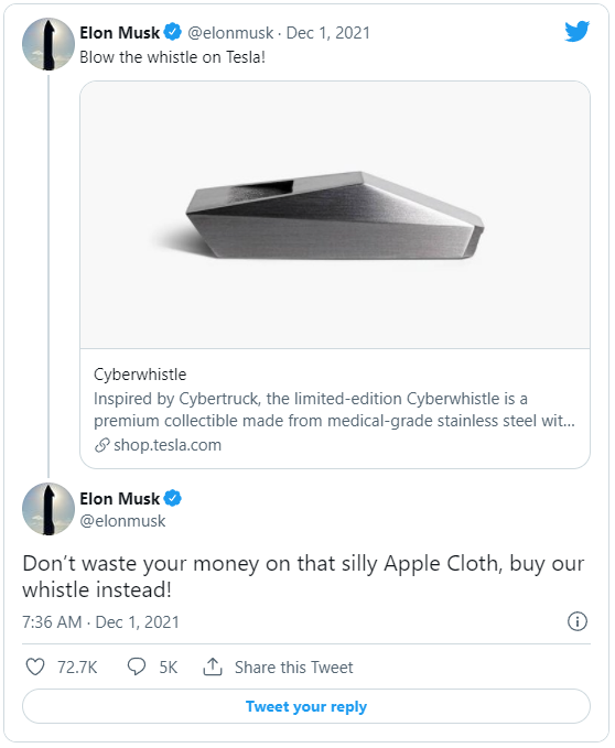On his Twitter, Tesla's CEO has just urged customers to buy the 'Cyberwhistle' for $50, a high-end whistle made of medical-grade stainless steel inspired by the company's Cybertruck SUV – instead of purchasing the $19 Apple Cloth.