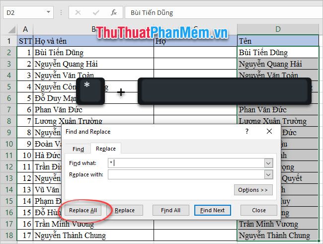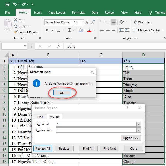 Click Replace All to start removing middle names and leave only the Last Name.