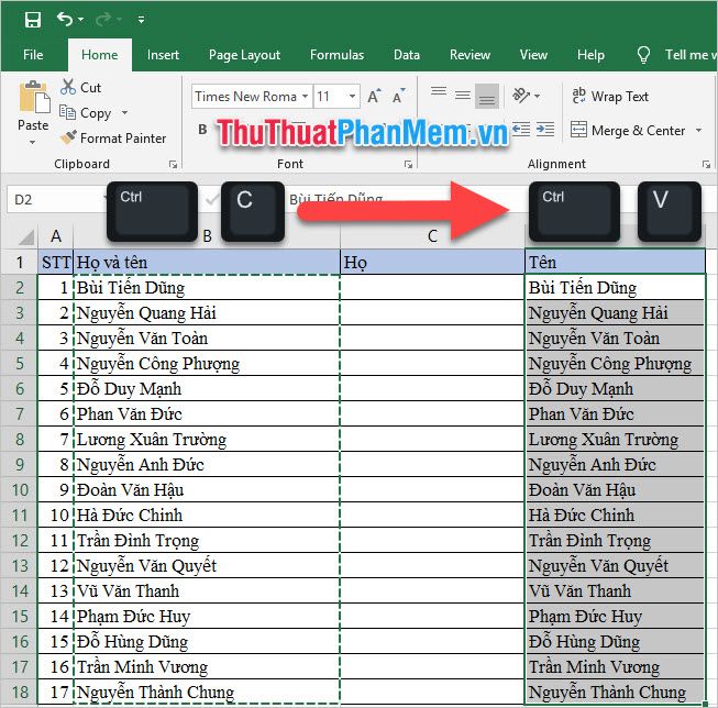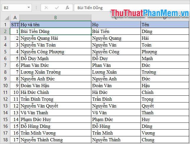 With method 1, you can separate the Name into a fixed column, but when you need to change the data in the Name column (source data), you will have to change the data in the Last Name column (result data) as well. Mytour will share another method of splitting names using functions, so when you change the data in the Name column, the data in the Last Name column will automatically change.