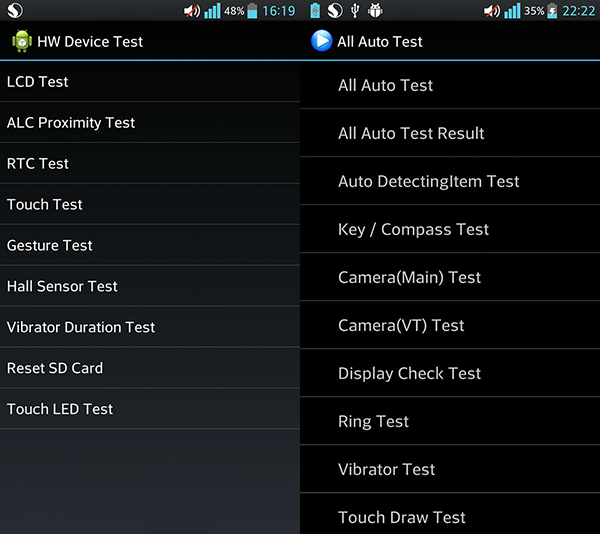 - All auto test: automatically tests three items for you: Usim card - sim, SD card - memory card, and Earphone - headphone