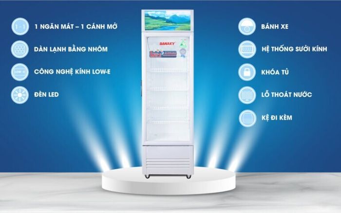 - The body of the Sanaky 1-door vh-168kl fridge is made of high-quality ABS plastic with a sturdy shelf system. There are 4 shelves. The body has a door that opens from left to right in the user's line of sight, made of durable, transparent 2-layer toughened glass for easy observation of displayed products inside. The handle is integrated with a theft-proof lock to ensure safety for households with young children and to prevent unauthorized removal of items from the fridge.