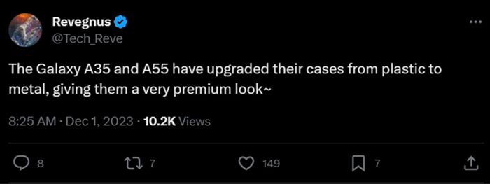 According to leaker Revegnus, the successor to the Galaxy A54 is likely to feature a metal frame made of aluminum instead of using a plastic frame as before. If this information is correct, it would be a significant upgrade for the Galaxy A55 as no Galaxy A device has been equipped with a metal frame before.