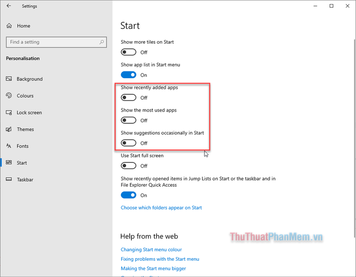 Step 3: Next, locate the Start tab and turn off the following features one by one: