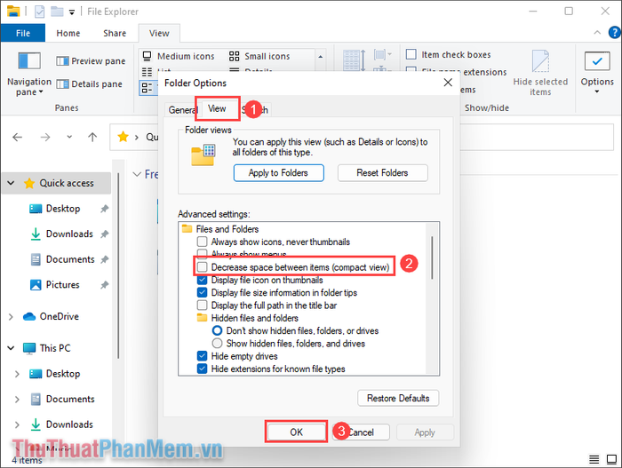 Step 2: Then, go to the View (1) tab and choose Decrease space between items (compact view) (2) to condense the root folder toolbar.