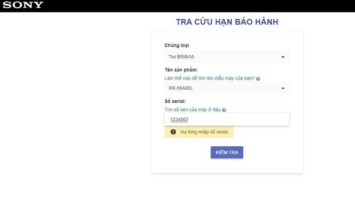 Here, you enter all the information of your TV as instructed on the website and click search. The system will return data about the warranty period of the Sony TV you are using, whether it is still valid or has expired.
