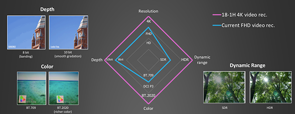 Significant camera upgrade, 4K HDR video recording using BT.2020 color standard in HEVC 10-bit format, 960fps video capture